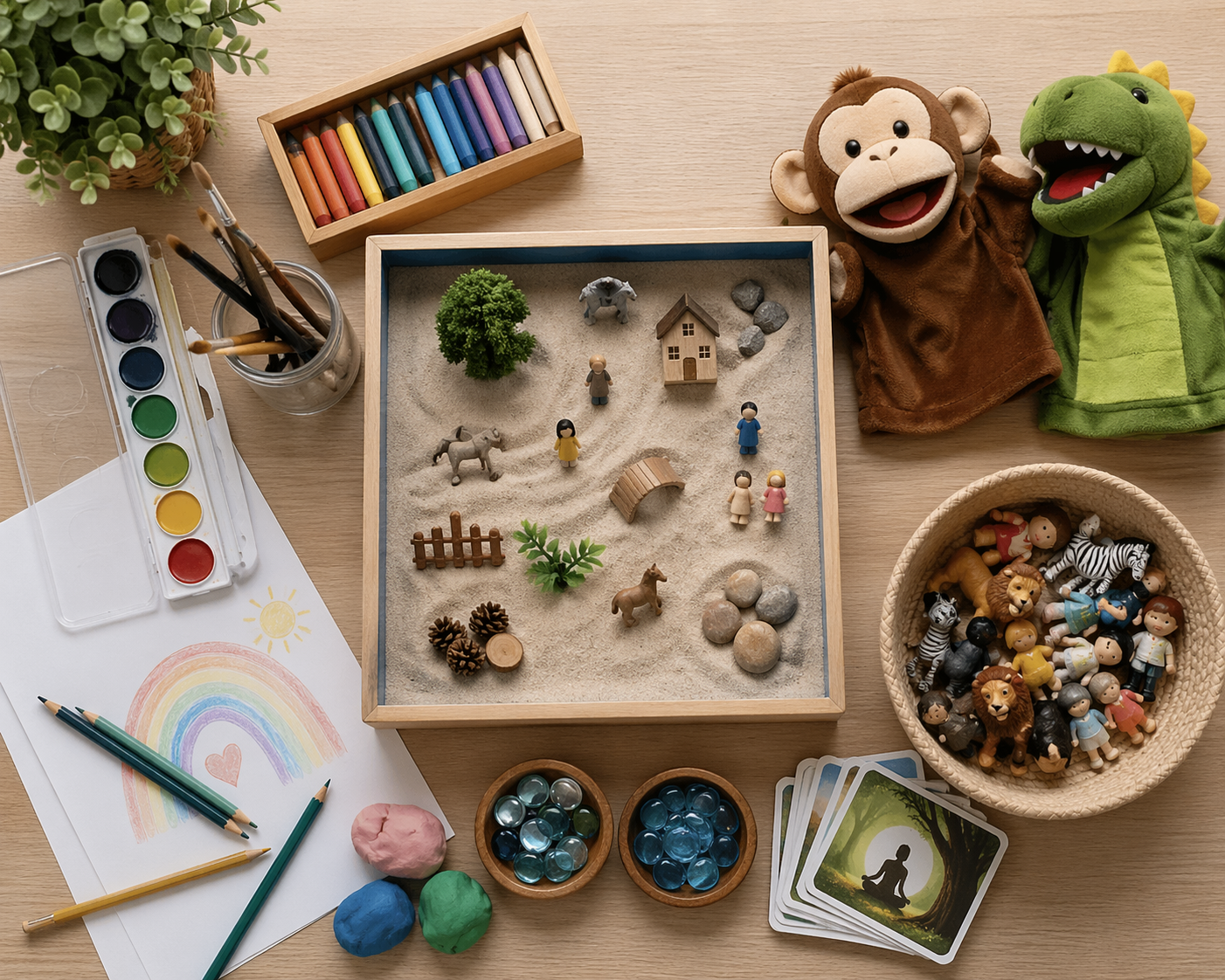 Within play therapy sessions, children are supported to express themselves through a range of creative and sensory experiences, such as drawing and painting, sand trays, clay, puppets, storytelling, movement and music. These tools allow children to explore their thoughts and feelings in a way that feels comfortable and meaningful to them.